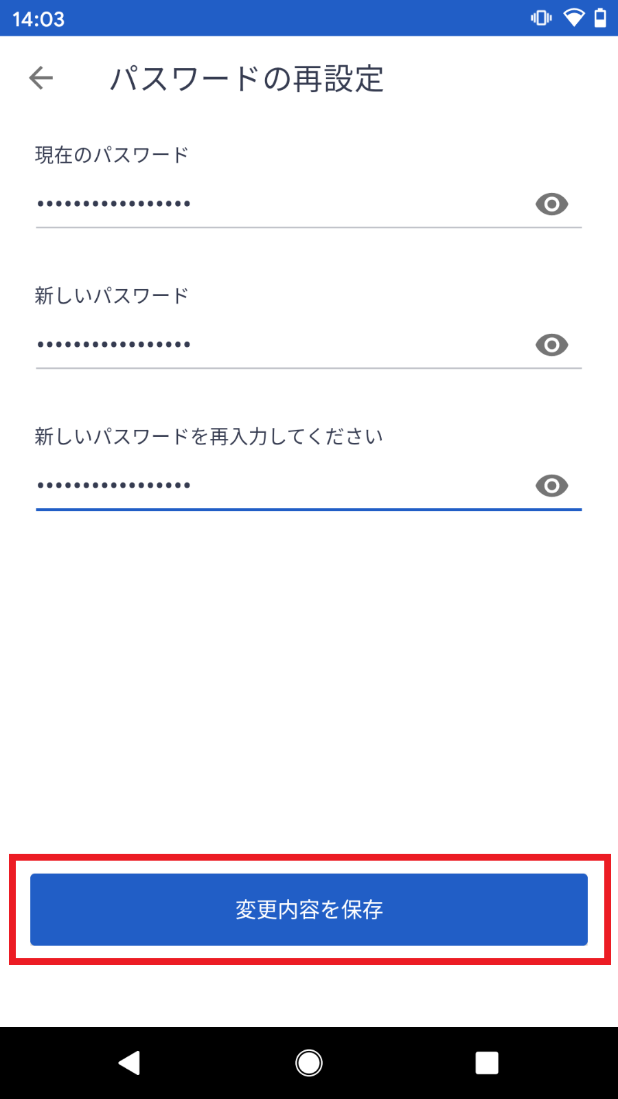 ![]() | 「現在のパスワード」と「新しいパスワード」を入力。 以上の手続きでパスワードの設定変更が完了します。 |