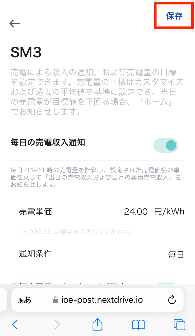 | 3-1. 売電収入通知の売電単価と通知条件を設定する。(任意) | 3-2. 売電目標値などを設定する。(任意) |